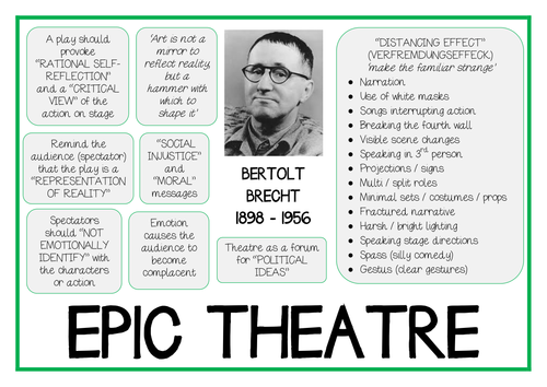 Epic theatre, is a theory that brecht believed in encouraging the idea that theatre should conform to the reasoning behind it, instead of focussing on bertolt brecht's work conformed to his theory of epic theatre. Brecht wanted to find a way to challenge his audience more than theatre did at the time. He wanted to make the audience think, and used a range of devices to remind them that they were watching theatre and not real life. Certainly brecht's attack on the illusive theatre influenced, directly or indirectly, the theatre of every western country. Although bertolt brecht's first plays were written in germany during the 1920s, he was not widely known until much later.